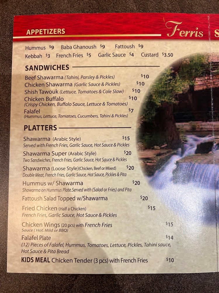 Introducing the menu at Ferris Shawarma, a Middle Eastern gem in Cleveland, Ohio. Known for their flavorful shawarma sandwiches and platters, this family-owned restaurant offers a variety of options for both meat lovers and vegetarians. From classic beef and chicken shawarma to falafel sandwiches, every dish is prepared with care and attention to detail. Customers rave about the deliciously seasoned meat, homemade sauces, and crispy fries that accompany every platter. With options for catering, takeout, and dine-in, Ferris Shawarma provides a welcoming and accommodating dining experience for all. Be sure to try their signature shawarma platters, complete with a side of garlic and chili sauce for an extra kick of flavor. Don't miss out on this hidden culinary gem in Lakewood Heights - Ferris Shawarma is a must-visit for all food enthusiasts.